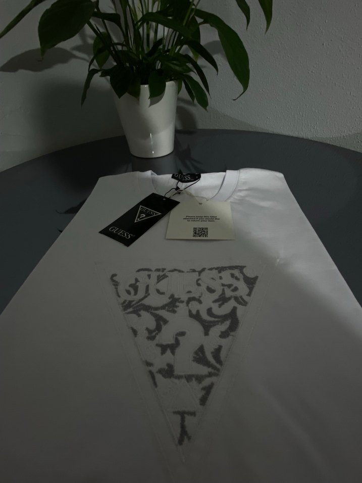 Beyaz renkli guess nakışlı tişörtü, kısa kolludur. Yumuşak sentetik kumaştan üretilmiş, önünde gri baskılı deseni vardır. Normal boy ve rahat kalıptadır.