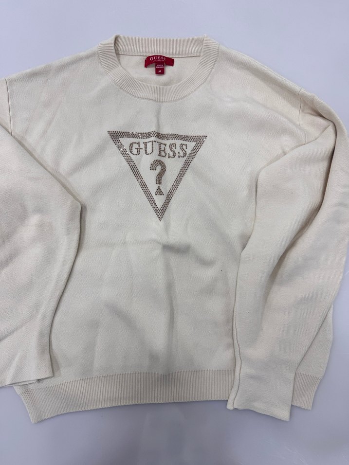 GUESS marka, beyaz pamuklu, yuvarlak yakalı ve uzun kollu, bol kesim kadın sweatshirt. Örgü dokusu ve önünde ikonik GUESS logosu bulunur.