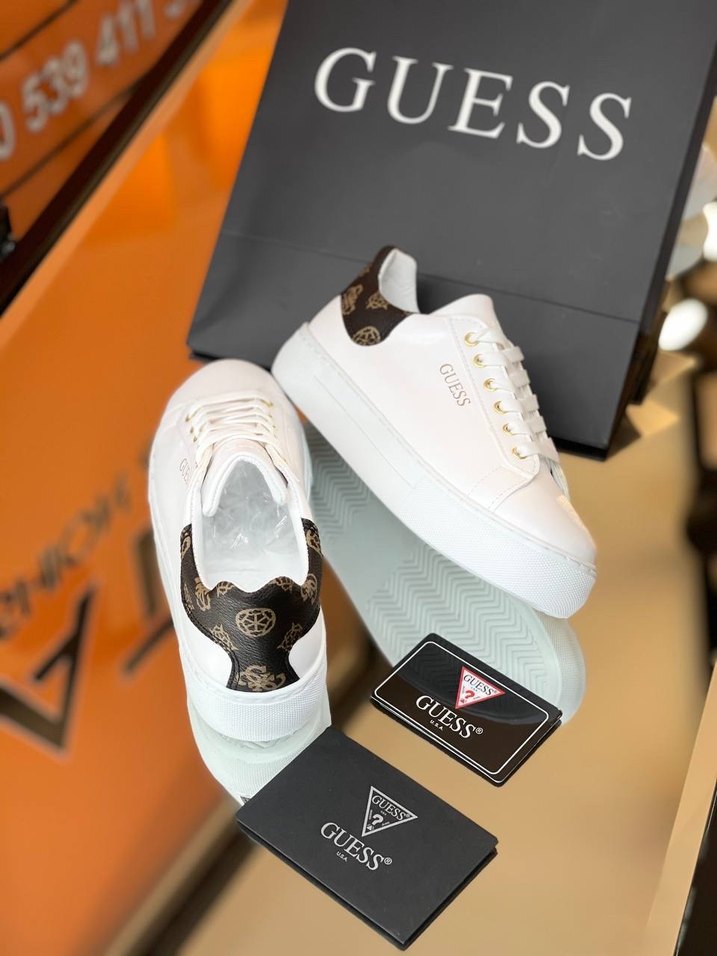 GUESS marka, baskılı detaylara ve cırt cırtlı tasarıma sahip beyaz platform kadın sneakers. Parlak kauçuk tabanlı, sokak stili için uygun.