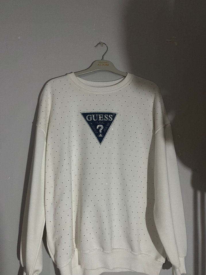 Guess markalı beyaz sweatshirt, uzun kollu ve yuvarlak yaka. Pamuklu kumaştan, bol kesim ve normal boyda. Önünde küçük nokta desenleri ve Guess logosu bulunur. Düğme detaylıdır.