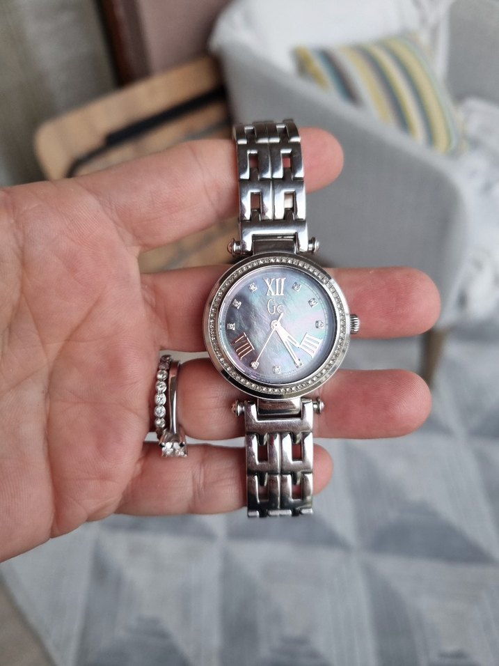 33mm çaplı az kullanılmış,alındığı tarihli garanti belgesi mevcut. Roma rakamlı yuvarlak kadran ve zarif taş detayları modern klasik tarz sunar. ⌚