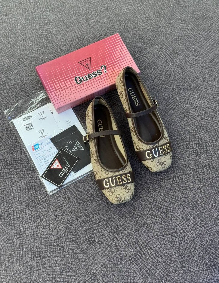Guess markalı, baskılı desenli, tokalı, kahverengi ve gri tonlarında, blok topuklu kadın babet. Günlük sokak stili için uygundur.