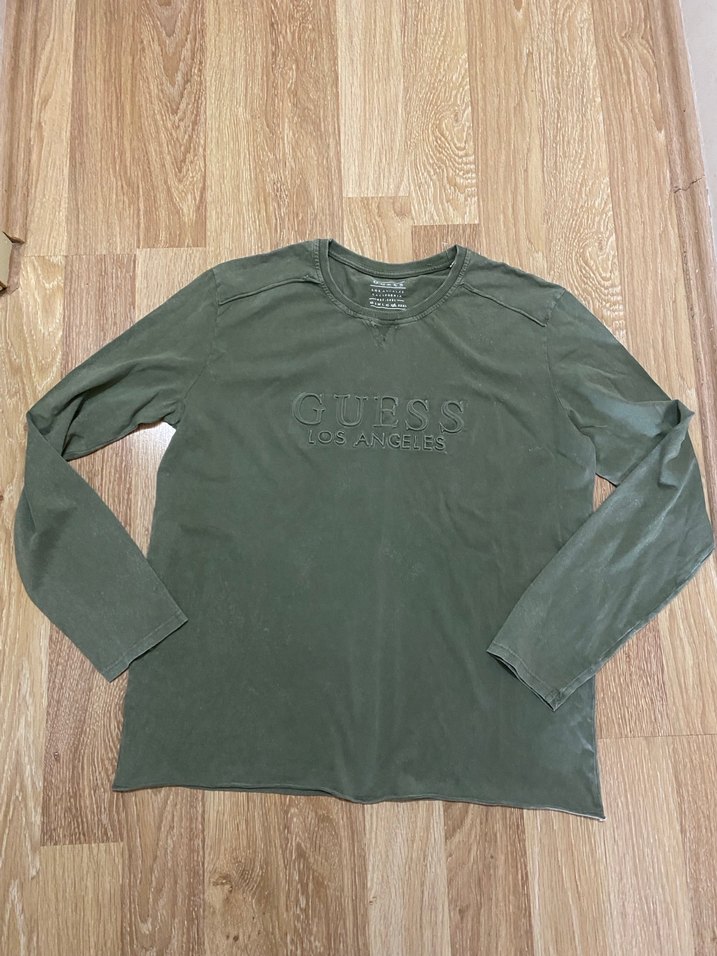 Guess marka, iki koltuk 60 boy 73 cm uzun kollu, yuvarlak yaka, bol kesim, yeşil erkek tişört. Yumuşak keten kumaştan, günlük rahat stil için uygundur.