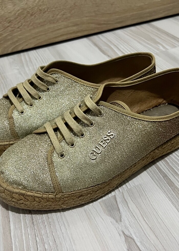 Guess simli espadrill. 1 veya 2 kez kullanıldı. Hiç bir hasadı yoktur. 40 numara, 39 giyenede oluyor. Tabanı hasır. Orjinal ürün. Tam yazlık ürün