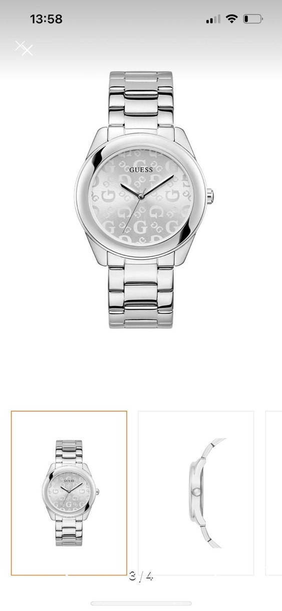 Guess marka, gri kadranında tekrarlayan 'G' logoları ve tokalı metal bilezikle klasik ve çağdaş tarzı birleştiren kadın saati. ⌚