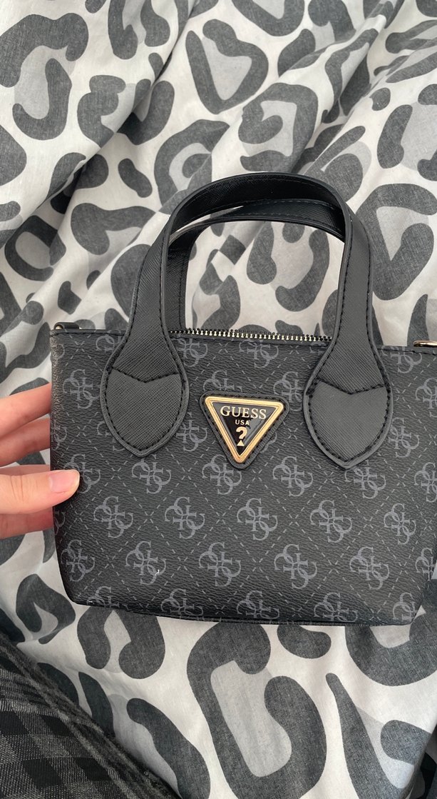 Guess markalı, gri desenli sentetik kumaştan, fermuarlı ve kısa saplı kadın el çantası. Trend sokak stili için uygun.