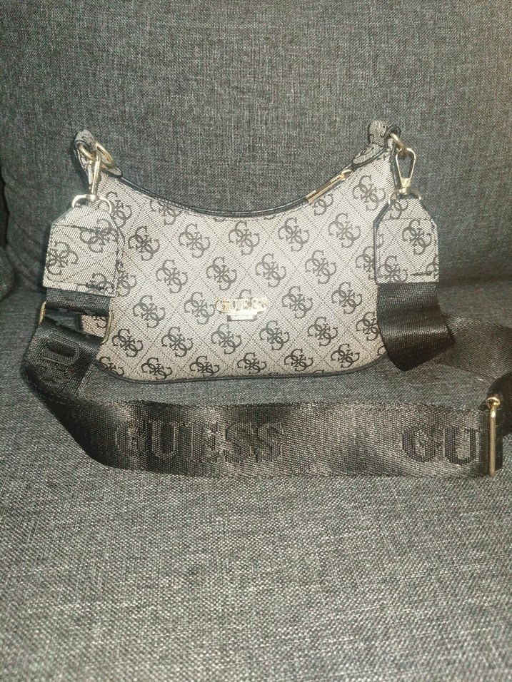 Gri renkte, baskılı desene sahip Guess markalı tokalı kadın çantasıdır. Sentetik kumaştan üretilmiş, trend ve günlük kullanıma uygundur.