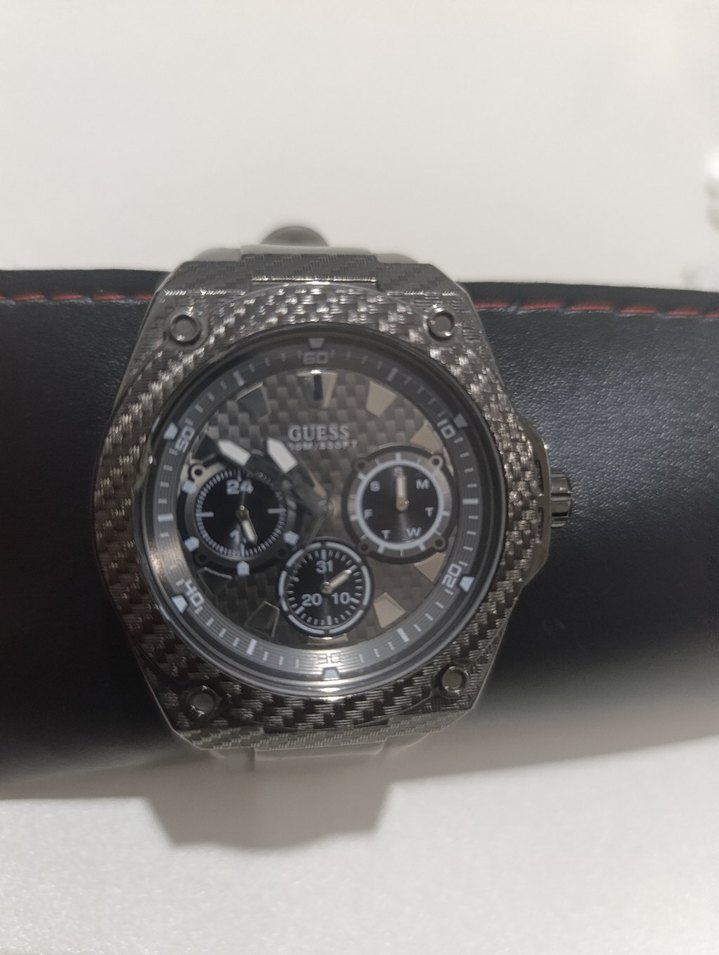 Guess erkek saati, gri karbon fiber görünümlü kadran ve çoklu alt kadranlarla biker tarzını iş stiline uyarlıyor. ⌚