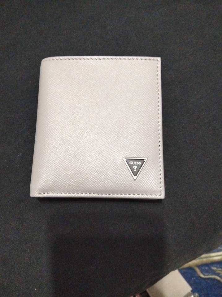 Guess markalı, baskılı desene sahip gri deri erkek cüzdan, tokalı tasarımıyla günlük iş kullanımı için uygun.