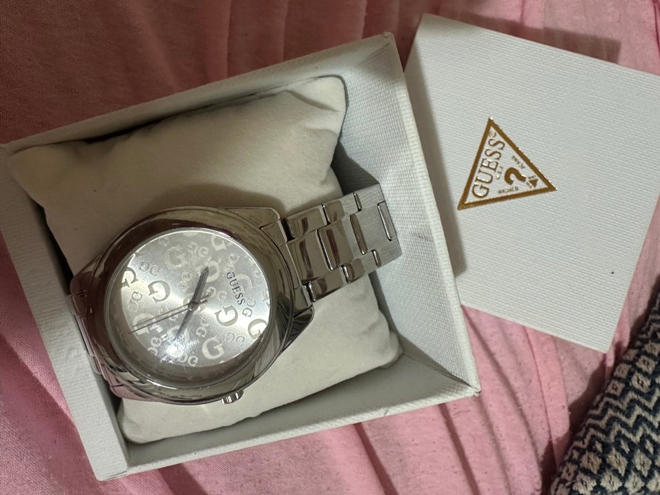 Guess markalı gri kadranlı kadın kol saati, tokalı metal kayış 2 kez kullanıldı garanti belgesi duruyor çok şık zarif bir saat