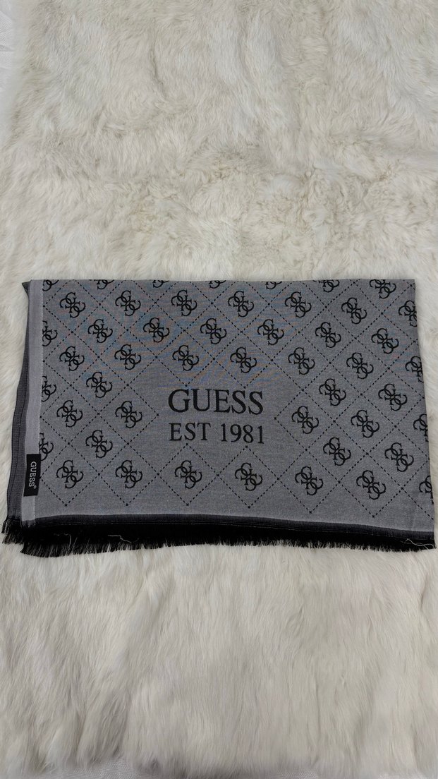 Guess markalı gri kadın şal, yumuşak sentetik kumaş ve kürk detaylarına sahiptir. Rahat, bohem tarzıyla sokak modasına uygundur. Üzerinde Guess logosu ve EST 1981 baskısı bulunur.
