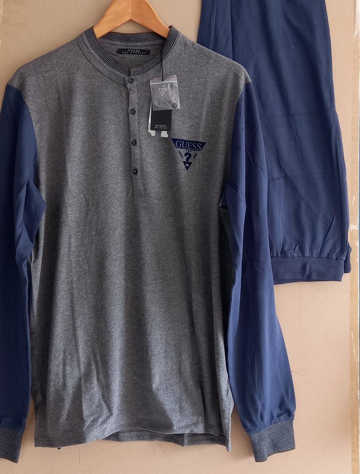 GUESS markalı, düğmeli yuvarlak yaka, uzun kollu ve bol kesim pamuklu erkek tişörtü. Göğüs kısmında baskılı logo bulunur, günlük rahat EV stili için uygundur.