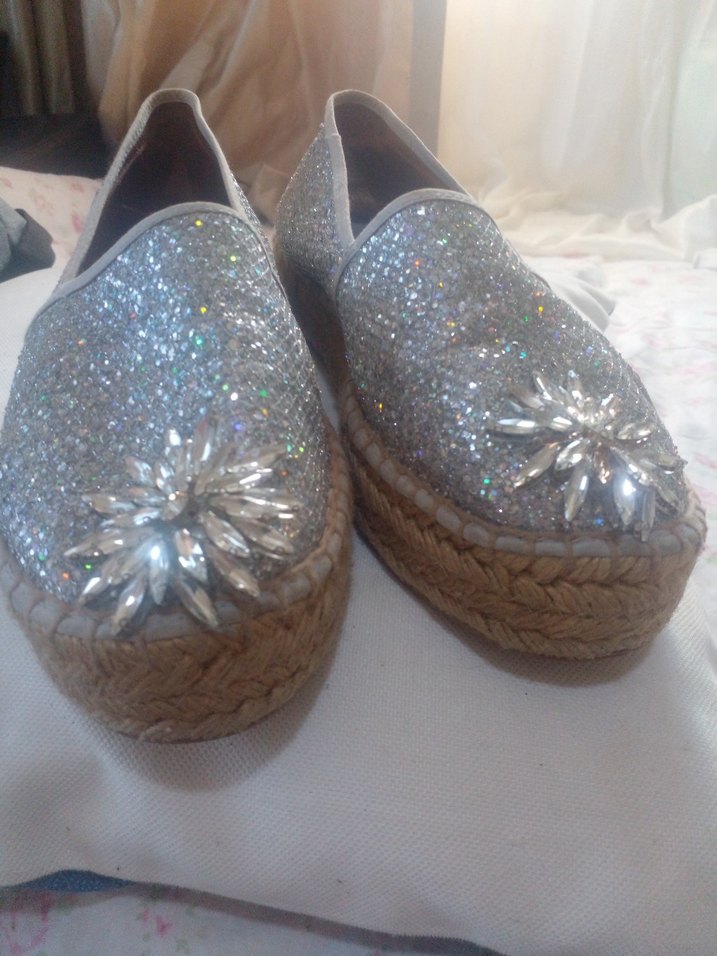 Guess marka Gri örgü espadriller, dolgu topuklu, payetli ve nakışlı detaylara sahip, bohem düğünler için uygun. ✨