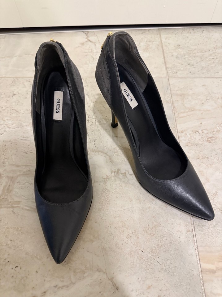 Guess marka, gri, arkasında pirinç fermuar detaylı stiletto. Ofis ve özel gün kullanımı için uygundur. Kutusu veya bez torbası yoktur.