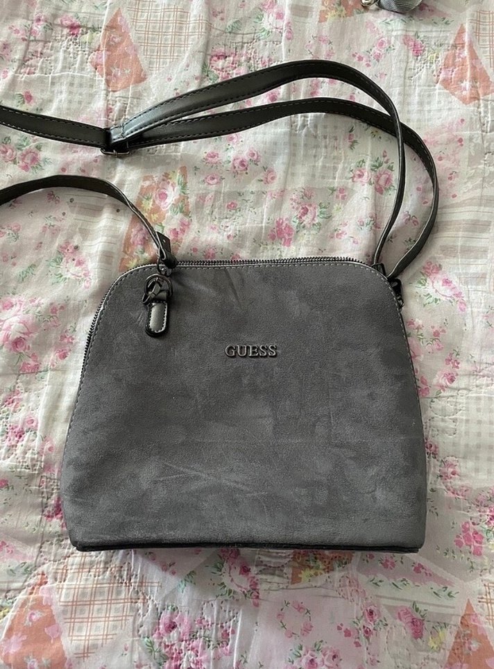 GUESS marka gri süet kadın çanta, tokalı detaylara sahip. Günlük kullanım ve sokak modasına uygun, desen içermeyen şık bir tasarım sunar. Uzun askılıdır.