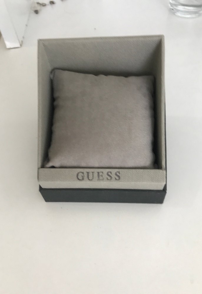 GUESS marka, yumuşak gri süet malzemeden Üzerinde baskılı desen bulunur ve kutusunda GUESS logosu yer alır orjinal kutu