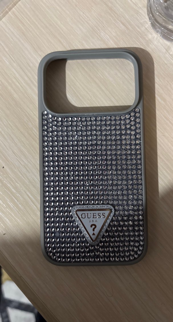Orijinal bir kere kullandım sadece tek bir taşı düşmüş GUESS marka, gri renkli taş detaylı ve fermuarlı cep özellikli telefon kılıfı, sokak stiliyle işlevselliği birleştirir.