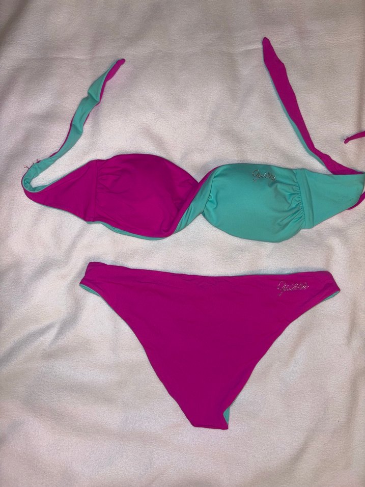 Çift taraflı kullanılan iki renkli bikini %100 orijinaldir. Üstü hem straplez hem ortadan bükülerek kullanılıyor Çok temizdir bir kere kullandım bedeni çok ufak daha doğrusu ben çok kilo aldım 34 36 beden için uygundur