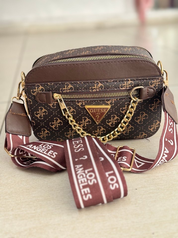 Guess marka kahverengi deri çapraz çanta, baskılı desene ve bel detaylı tasarıma sahip. Altın zincir ve Los Angeles yazılı askı ile trend sokak stili için uygun.