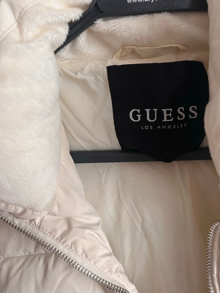 Guess markalı, kapüşonlu, uzun kollu, beyaz renkli, yumuşak dokulu ve kürklü detaylı, baskılı desenli, midi uzunlukta dar kesim mont.
