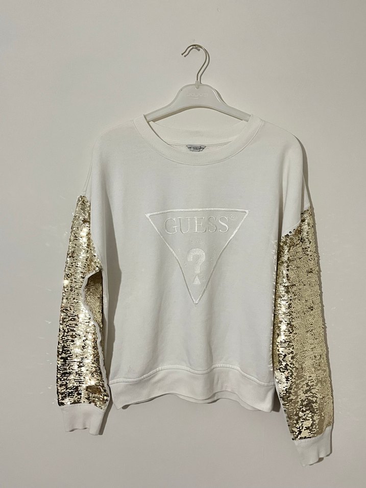 Guess markalı orjinal beyaz sweatshirt, uzun kollu ve payet detaylıdır. Pamuklu kumaştan üretilmiş, rahat ve normal boydadır. Önünde baskılı logo bulunur. ✨ Boy 58cm - Bel genişliği 54m dir. Kol boyu 48cm dir.