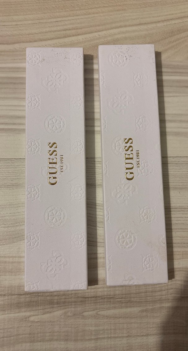 Orjinal, Guess kadın bileklik ambalaj paketi. Şık ve zarif ambalajında kabartmalı desen ve altın renkli yazılarla sunuluyor. 2 adet. Her birinin fiyatı 100 tl.