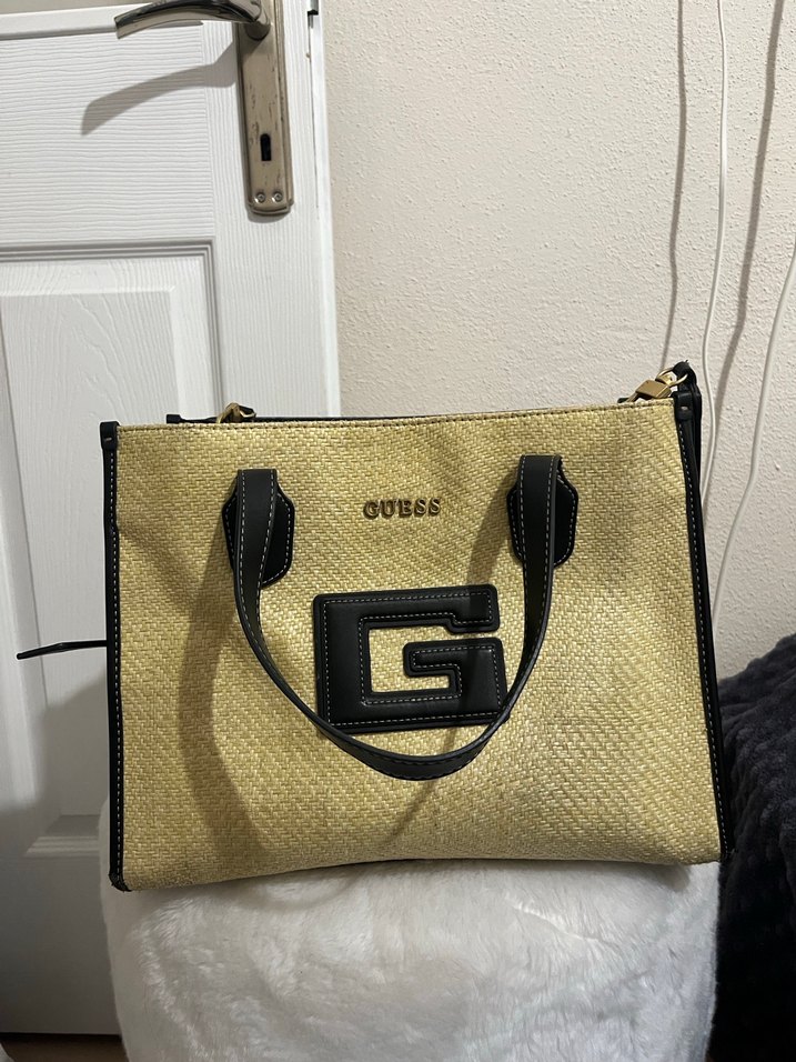 Orijinal Guess çantadır. Sadece 2-3 kez kullanıldı. Hediye gelmişti. İçi oldukça geniş, birçok eşya almakta. Soyulma, çatlak vs hiçbir sorunu yok. Sadece içinde bir ruj lekesi var, görselini ekledim. Onun dışında kusursuz, yeniden farksız.