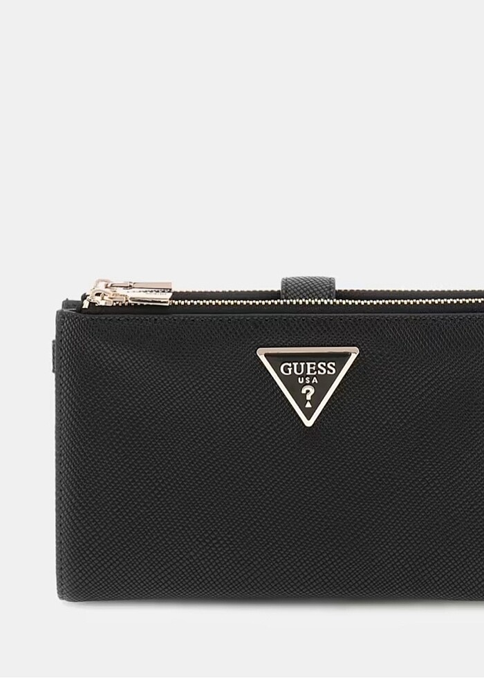 GUESS Laurel Saffiano cüzdan. Suni deri dış yüzey. Çift fermuarlı ve düğmeli kapama. Donuk altın rengi metal aksam. Seri:Laurel Saffiano dokulu. Uzun tak çıkar el askısı. Çift bölmeli. Kart bölmeleri. Fermuarlı çift bölmeli bozuk para gözü. Önde metal üçgen logo.