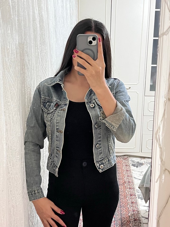 GUESS Gri eskitme desenli, düğmeli, yakalı ve uzun kollu, normal boyda kadın denim kot ceketi. Günlük kullanıma uygundur. Mükemmel bir kot ceket