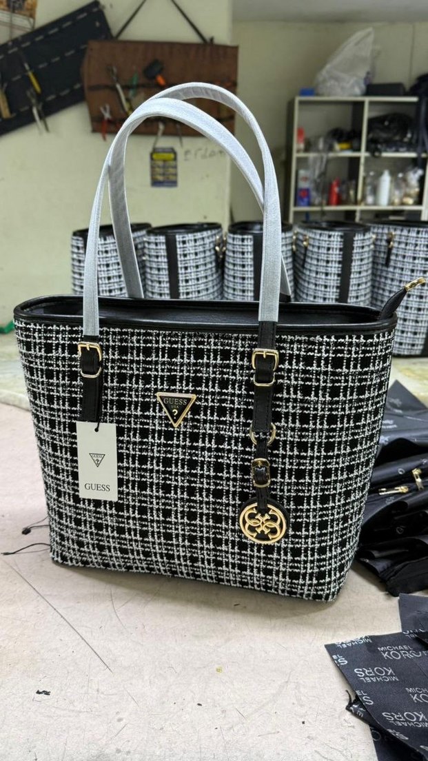 Guess markalı, tokalı askıları ve gri desenli kumaşıyla günlük sokak stili için uygun geniş omuz çantası.