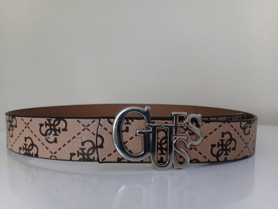 Gümüş Guess logosu tokalı kahverengi deri kemer, sokak modası Paris tarzında. Trendy casual görünümler için uygun.