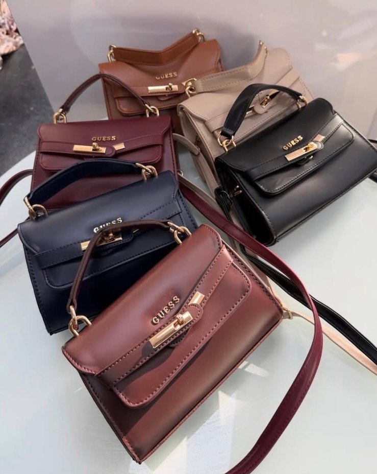 Guess markalı, kahverengi deri, tokalı ve baskılı desenli, modern klasik tarzda kadın çantası. Günlük kullanım için uygundur.