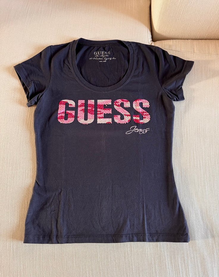 Guess markalı, kısa kollu, yuvarlak yakalı, dar kesim kadın tişörtü. Koyu renkte, pembe baskılı logo bulunur. Sokak stili için uygundur. iki koltukaltı arası 42 cm, boyu 58 cm’dir.