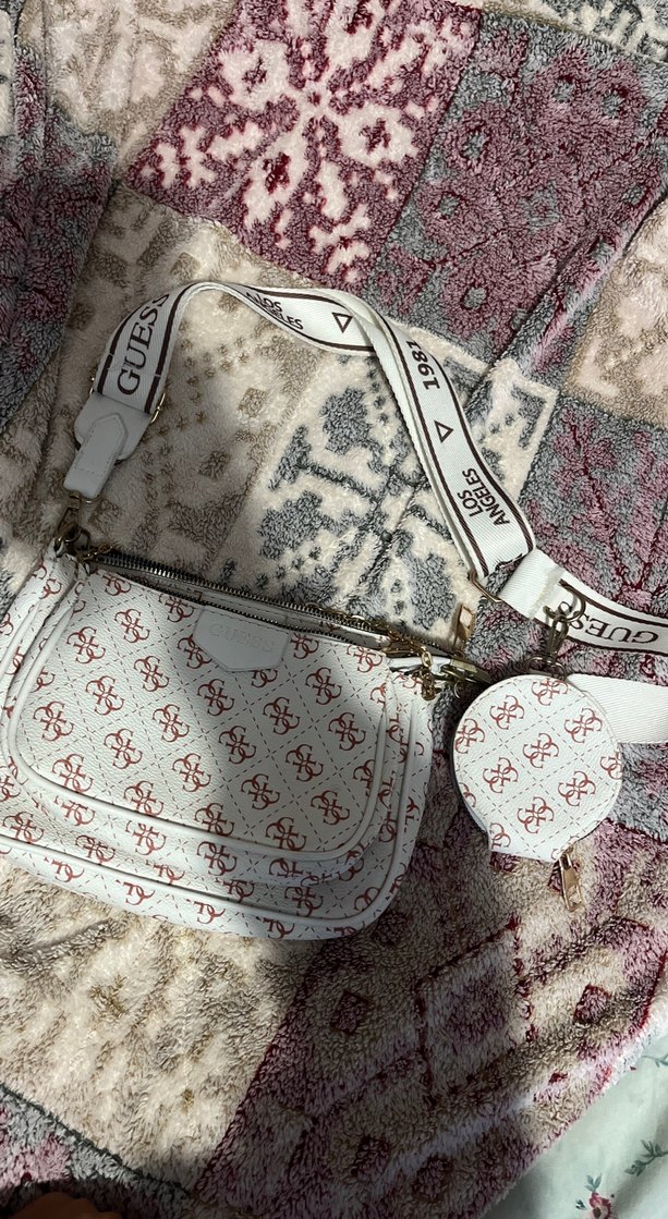 Beyaz baskılı kadın omuz çantası, kürk detaylı çıkarılabilir bozuk para cüzdanı ve ayarlanabilir markalı askıya sahiptir.