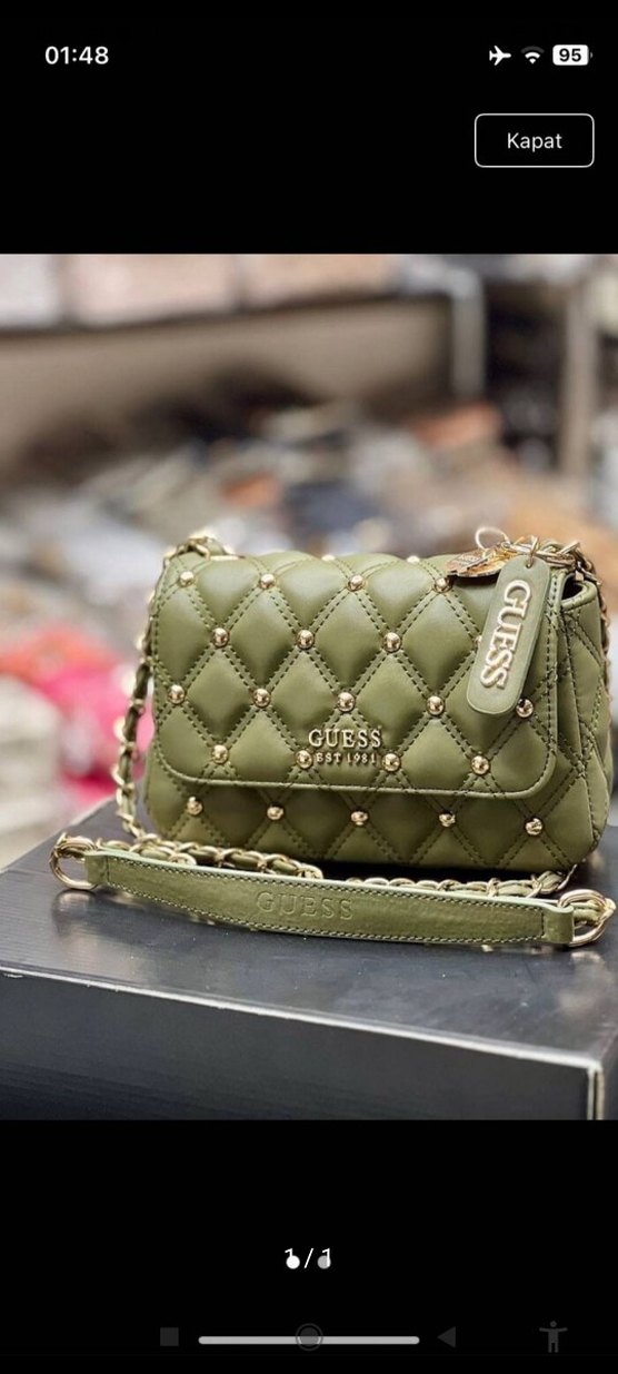 Guess markalı, parlak haki kapitone desenli, tokalı ve işlemeli sentetik kumaştan kadın çantası. Zincir askılı, günlük kullanıma uygun. ✨