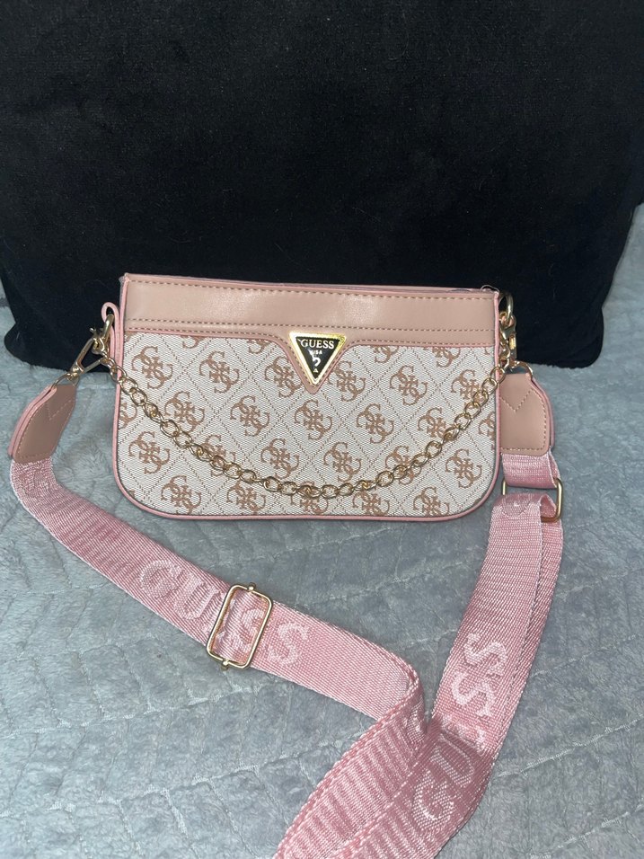 Guess markalı, pastel pembe renkli baskılı, kemerli tasarıma sahip kadın çapraz çanta. Sentetik kumaş ve ayarlanabilir askı ile günlük kullanıma uygun.