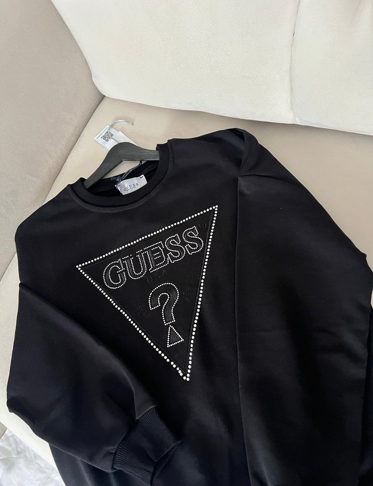 Siyah Guess sweatshirt, yuvarlak yaka ve uzun kollu, bol kesim. Üç iplik kumaş kardonsuz s/m/l bedenleriyle