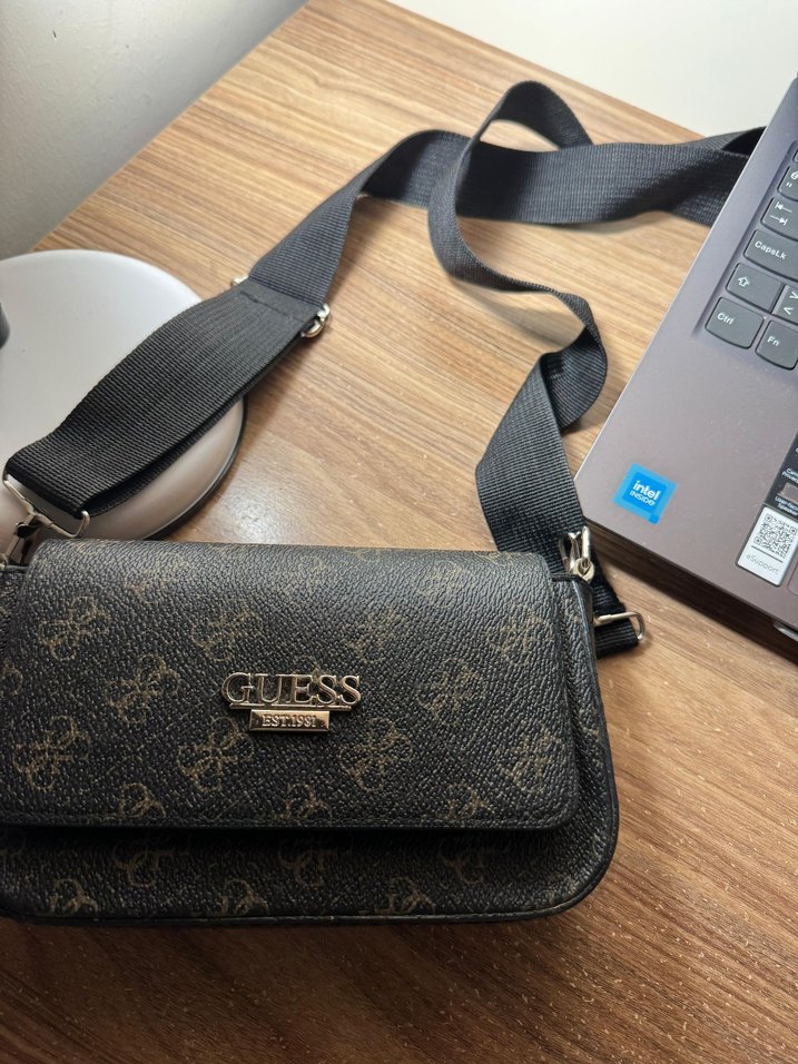 Guess marka, kahverengi baskılı deri kadın çanta, tokalı kapak ve ayarlanabilir geniş askıyla klasik ve sokak modası tarzını birleştirir.
