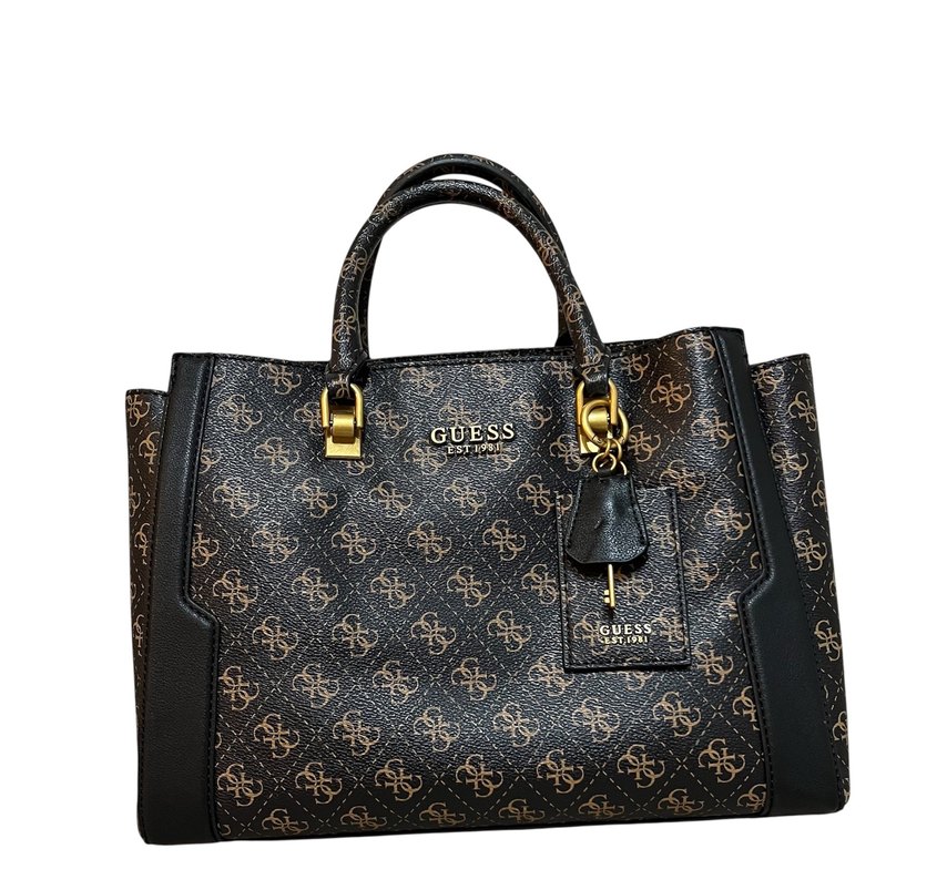 Guess marka, kahverengi baskılı deri, kemerli detaylı, altın renk aksesuarlarla modern klasik tarzda kadın çantası.