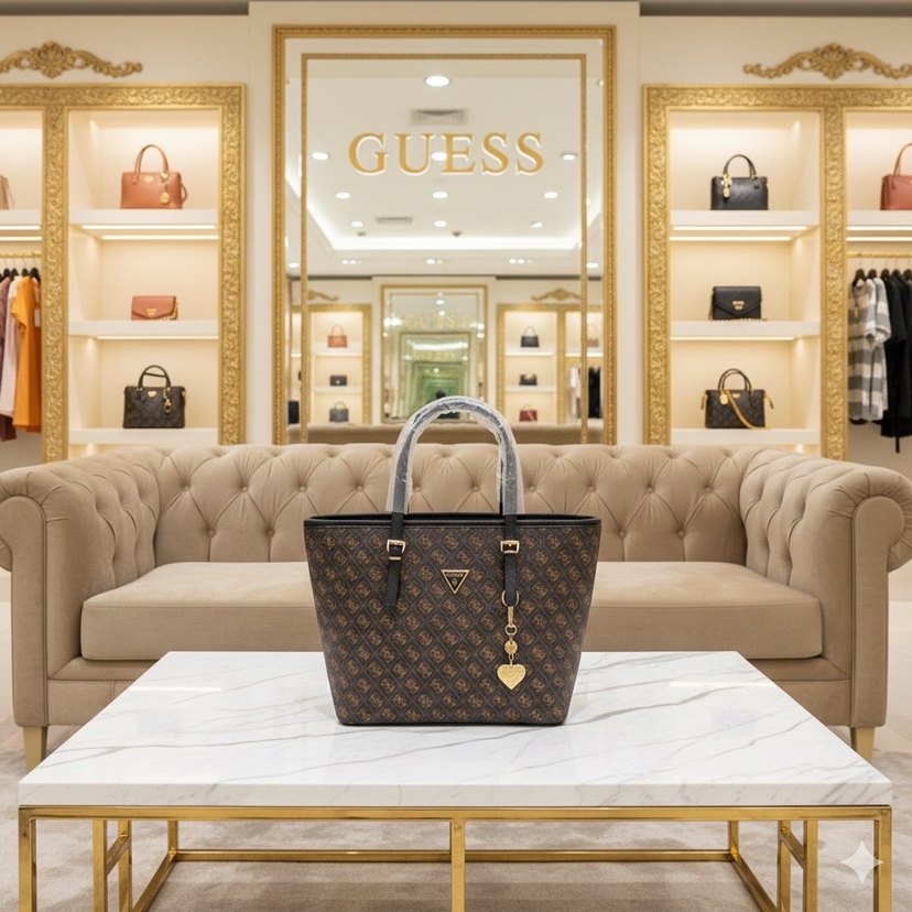 Guess markalı, parlak baskılı desene ve tokalı kulplara sahip kahverengi deri kadın çantası. Modern klasik ve Paris havası sunar, günlük kullanım için uygundur. En 34 boy 28 cm
