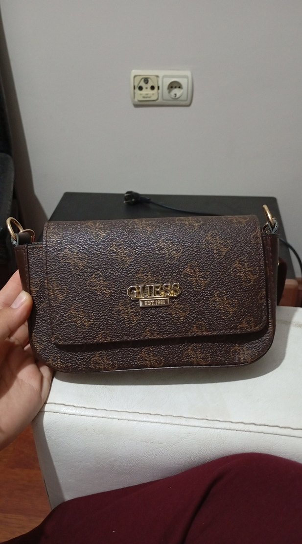 Kahverengi deri Guess kadın çanta, baskılı desen ve tokalı detaylara sahiptir. Sokak modası ve klasik zarafet stiline uygundur, günlük kullanım için idealdir.