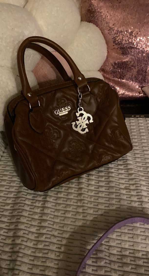 GUESS marka, parlak kahverengi deri kadın çanta, desenli ve tokalı tasarıma sahip. Günlük kullanım için klasik ve Paris sokak stilini yansıtıyor.