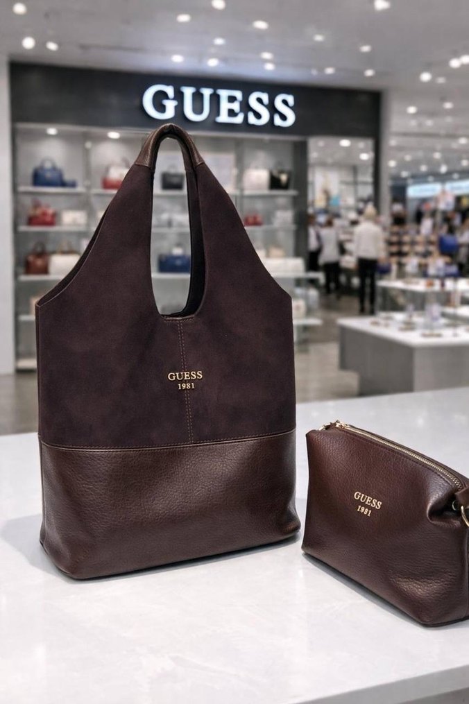 GUESS kahverengi deri kadın çanta, çağdaş tasarımı ve baskılı detaylarıyla klasik zarafet ve zahmetsiz şıklığı günlük kullanıma sunar.