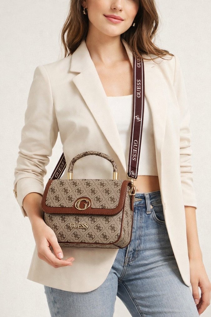 Guess markalı, kahverengi deri detaylı, baskılı desenli kadın çantası. Tokalı kapak, tutma sapı ve ayarlanabilir Guess logolu askısı bulunur. Modern klasik tarzda günlük kullanıma uygun.