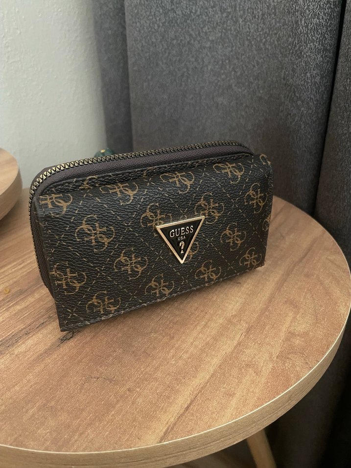 Guess markalı, kahverengi baskılı deriden yapılmış fermuarlı kadın cüzdanı, günlük kullanım için uygundur.