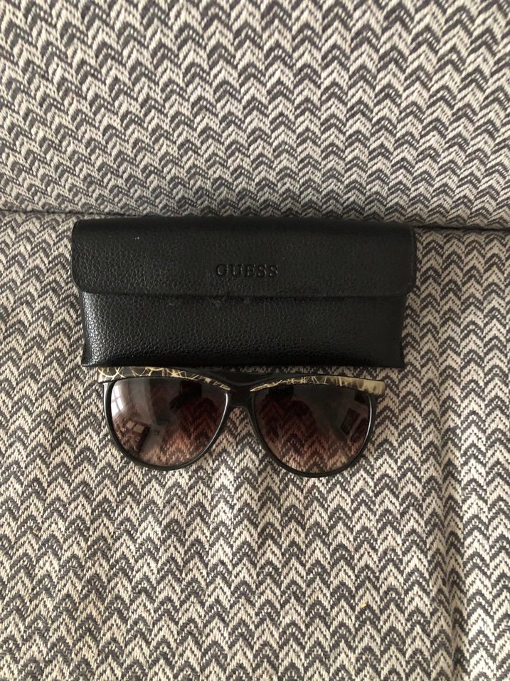Kahverengi retro tarzda kadın güneş gözlüğü, koyu renk camlı ve Guess marka fermuarlı siyah kılıf ile birlikte. Bohem ve karşı kültür stiline uygun. ️
