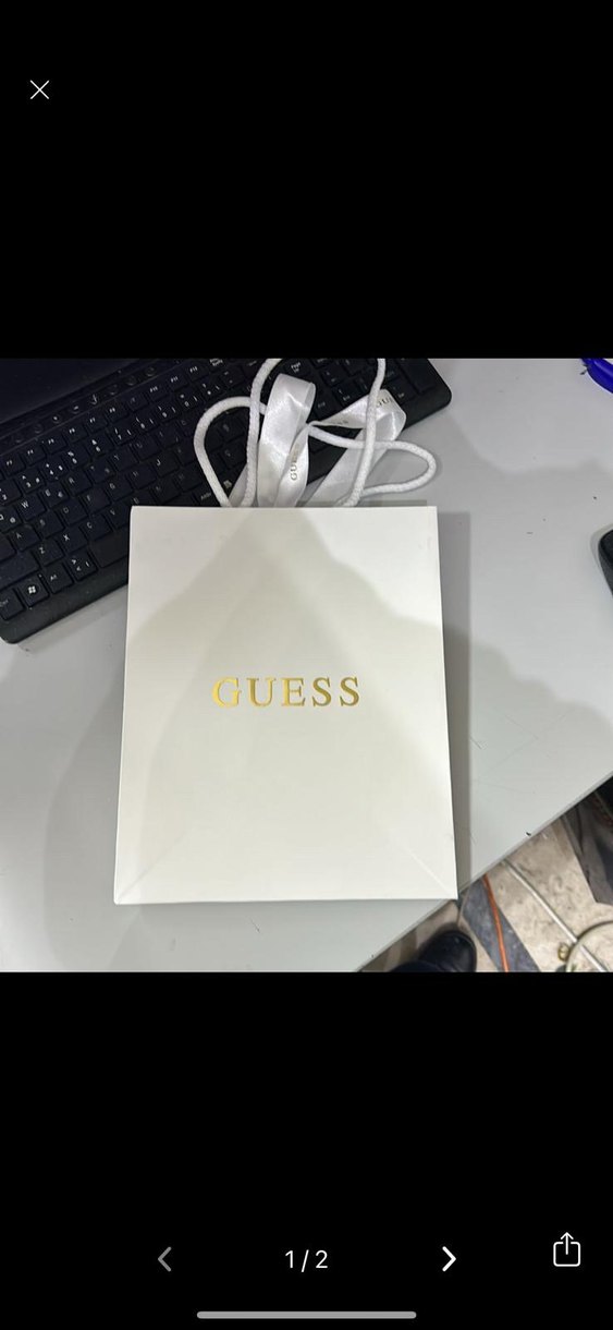 Guess markasına ait, altın renkli yazılı beyaz hediye çantası.