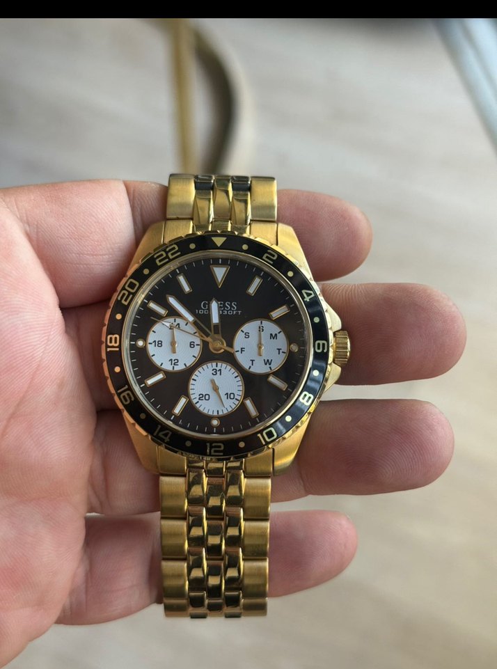 Guess markalı, altın renkli metal kordonlu, saati. Siyah beyaz kadranda çoklu alt kadranlar bulunur, klasik şıklık ve biker tarzı birleşimi. ⌚yeniden farkı yok sorunsuz 100 metreye kadar su geçirmez Orjinal guess en çok tutulan modellerinden biri.