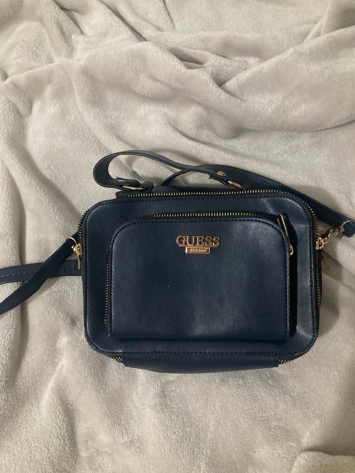 Guess markalı, koyu lacivert deri kadın çantası, tokalı ve önünde fermuarlı cep bulunur. Günlük sokak stili için uygundur.