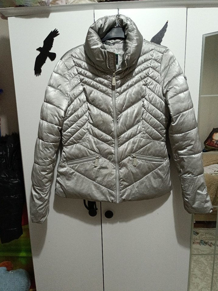Guess M beden kadın mont. boy:60 cm. iki kolaltı arası:50 cm. parlak gri renk. şişme mont gibi. #mbedenkısamont #guessmbedenmont